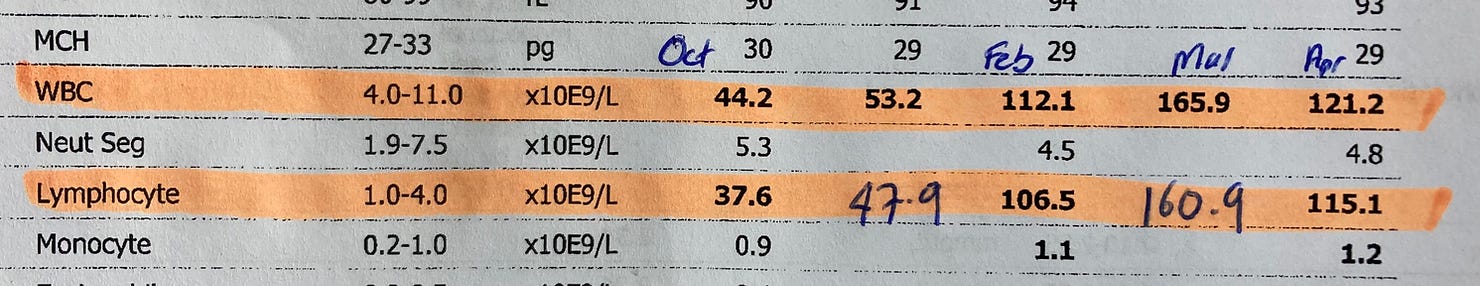 In my last blood test, only a month ago, my WBC was up to 165,000 (Lymphocytes 160,000) and my specialist had signaled the potential need to start treatment to reduce the CLL in my system. He was also testing for TP53 and IGHV mutation status - both of which have significant and serious implications on overall prognosis.